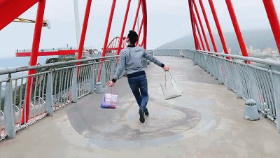 而全透明的玻璃延伸至悬崖之外!脚下就是万丈悬崖,身旁云朵飘飘,让大红点装饰的孕妇也疯狂了(危险动作经专业人士指导拍摄请勿模仿)。